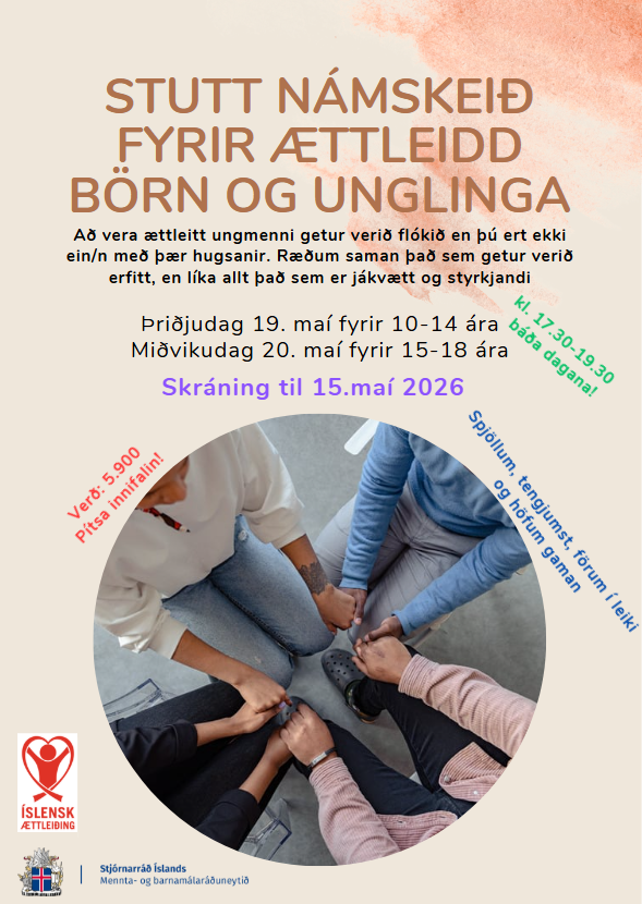 Þetta örnámskeið er hannað fyrir ættleidd ungmenni á aldrinum 10-18 ára og er skipt í tvö holl (19. og 20. maí næstkomandi frá 17.30-19.30). Kjörið tækifæri til að tengjast öðrum og hafa gaman en einnig líta aðeins inn á við og hlusta á aðra. Ekkert ungmenni þarf að tjá sig ef það vill það ekki en hugmyndin er að þessi hittingur verði kveikjan að öðru og meiru í haust.
