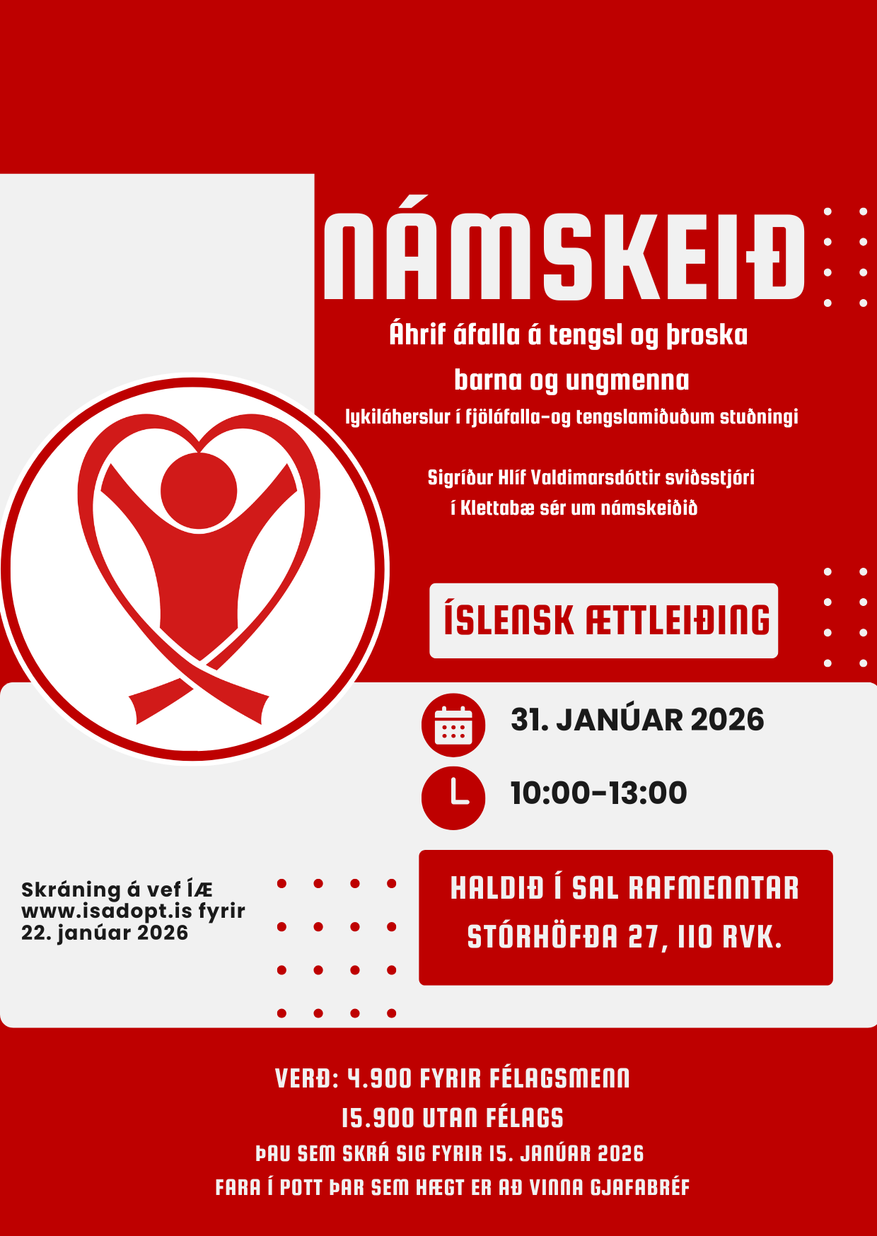 Íslensk ættleiðing stendur fyrir námskeiði um áhrif áfalla á tengsl og þroska barna og ungmenna (Complex-/Developmental trauma) og býður félagsmönnum að taka þátt gegn vægu gjaldi en námskeiðið er opið öðrum einnig. Farið verður yfir lykiláherslur í fjöláfalla-og tengslamiðuðum stuðningi.