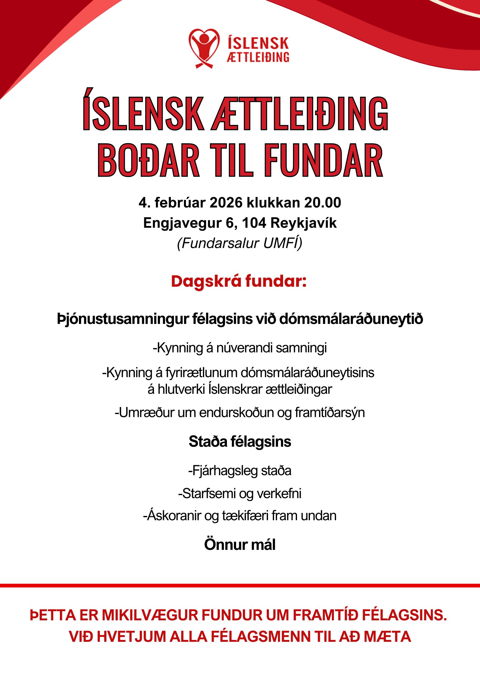 Stjórn Íslenskar ættleiðingar hvetur félagsmenn til að mæta á félagsfund þar sem staða og framtíð Íslenskrar ættleiðingar verður rædd í samhengi við nýjan þjónustusamning dómsmálaráðuneytisins þar sem áætlað er að gera verulegar breytingar á ættleiðingarmálaflokknum.